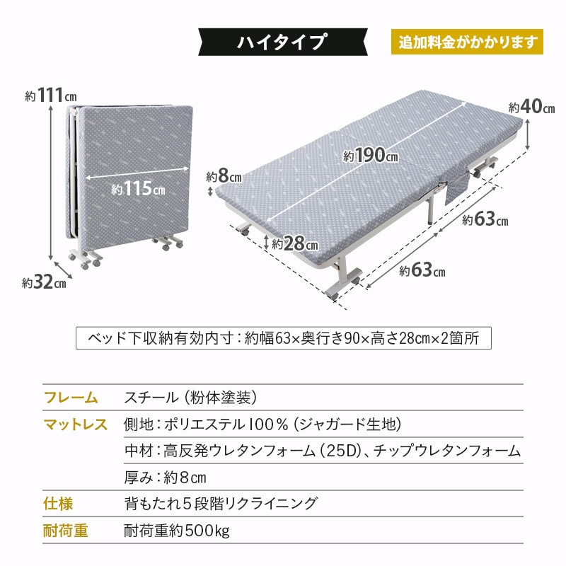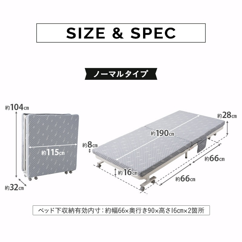 | サイズ | セミダブルサイズ ノーマルタイプ:約幅115×奥行190×高さ28cm (折りたたみ時:約幅115×奥行32×高さ104cm) ハイタイプ:約幅115×奥行190×高さ40cm (折りたたみ時:約幅115×奥行32×高さ111cm) マットレスの厚さ:約8cm |