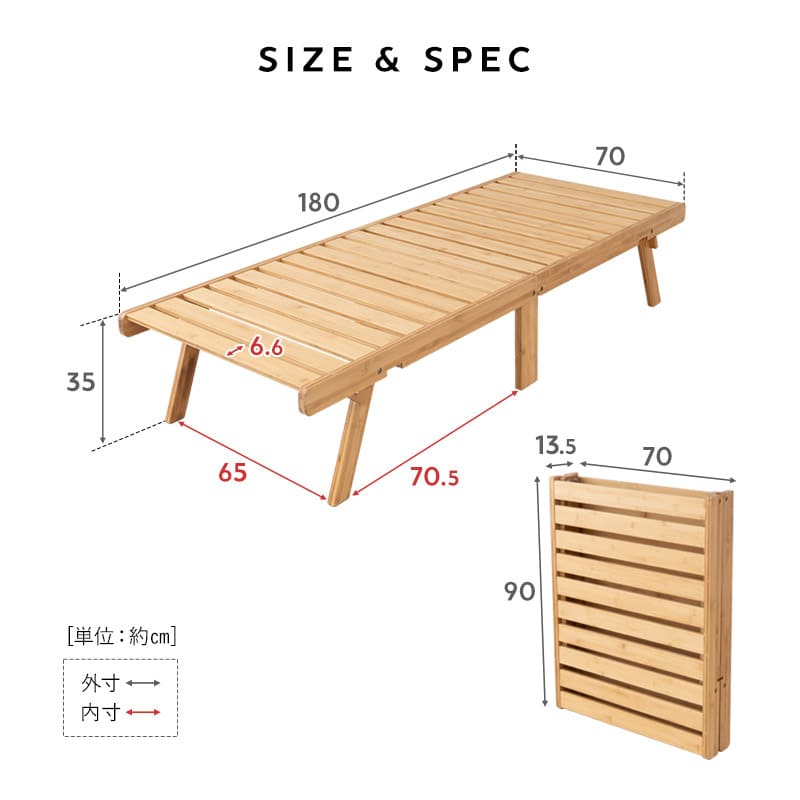 | 折りたたみベッド | ■サイズ 約幅70×奥行180×高さ35cm (折りたたみ時:約幅70×奥行13.5×高さ90cm) ■組成 天然竹(バンブー) ■商品重量 約15kg ■耐荷重 約200kg ■組立 組立不要(完成品) ※ベッドの折りたたみ部分に指を入れないでください。 ※ベッドに変形する際、中央の足がきちんと床面に対して直角に立っていることを確認してから、ご使用ください。 ※ベッドの上で一か所に体重をかけるように立たないでください。 |