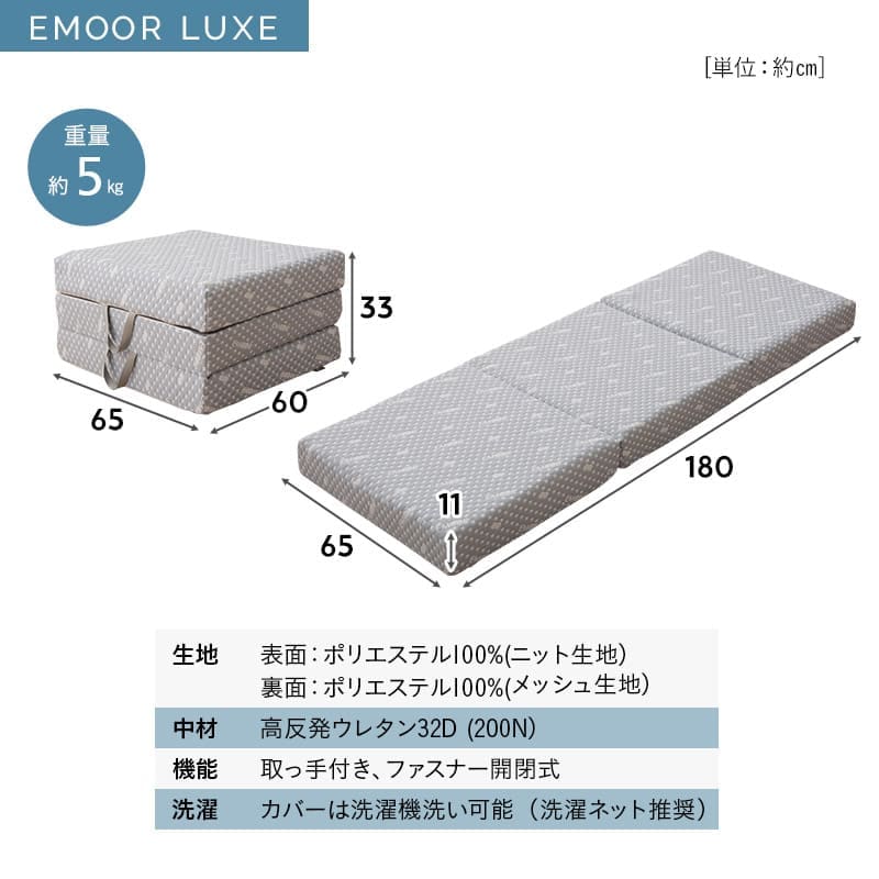 ■サイズ 約幅65×奥行180×厚さ11cm (折りたたみ時:約幅65×奥行60×高さ33cm) ■組成 表生地:ポリエステル100%(ニット生地) 裏生地:ポリエステル100%(メッシュ生地) 中材:高反発ウレタンフォーム 32D/200N ■商品重量 約5kg ■お手入れ方法 カバーを取り外して洗濯機洗い可能 ※洗濯ネット使用推奨 |