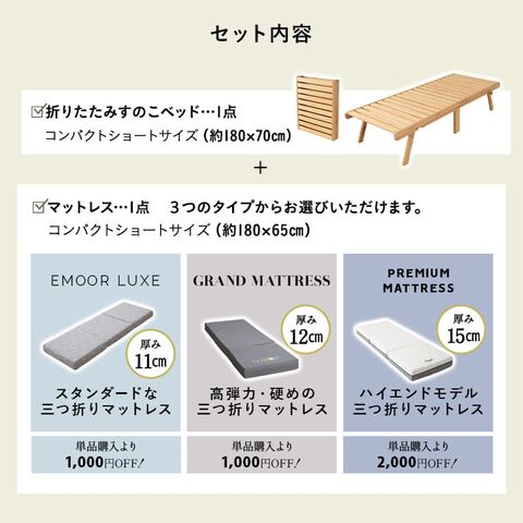 すのこベッド マットレス 2点セット 幅70cm コンパクトショート 完成品 竹製 天然竹 バンブー 抗菌 調湿 脱臭 三つ折り 折りたたみ 高反発 すのこ スノコ ベッド フレーム 小さい サイズ ごろ寝 通気性 除湿 コンパクト 収納 子供 来客用 新生活 送料無料 エムール