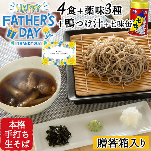 信寿そば4食+薬味3+鴨+七味缶【贈答箱】(父の日カード) 送料無料