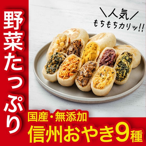 | 内容量 | おやき 1コ約100g×9コ(野沢菜・切干大根・きのこ・あんこ・なす・野菜・ポテト・かぼちゃ・にら 各1コ) |