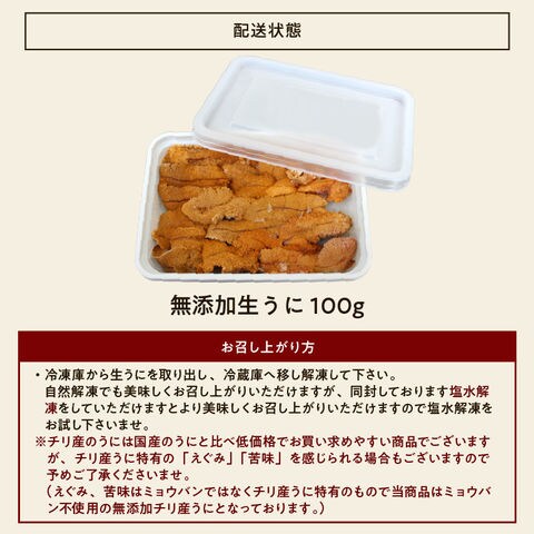 チリ産最上級グレード厳選! 無添加 ミョウバン不使用 生うに 100g (ブランチング処理) うに ウニ 雲丹 お寿司 食品 お取り寄せ 贈り物 ますよね 送料無料