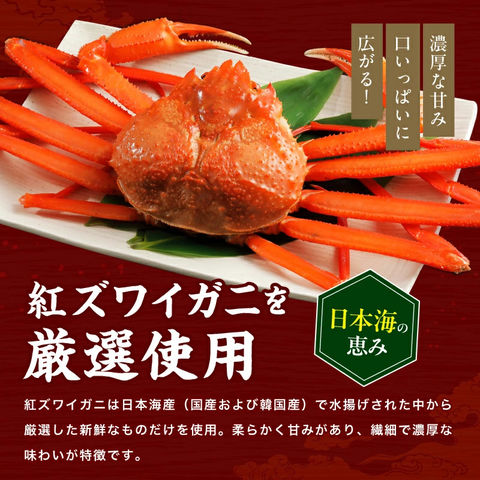 紅ズワイガニ(国産および韓国産)、食塩/甘味料(ソルビトール)、酸味料、調味料(アミノ酸)、酸化防止剤(ビタミンC)【内容量】