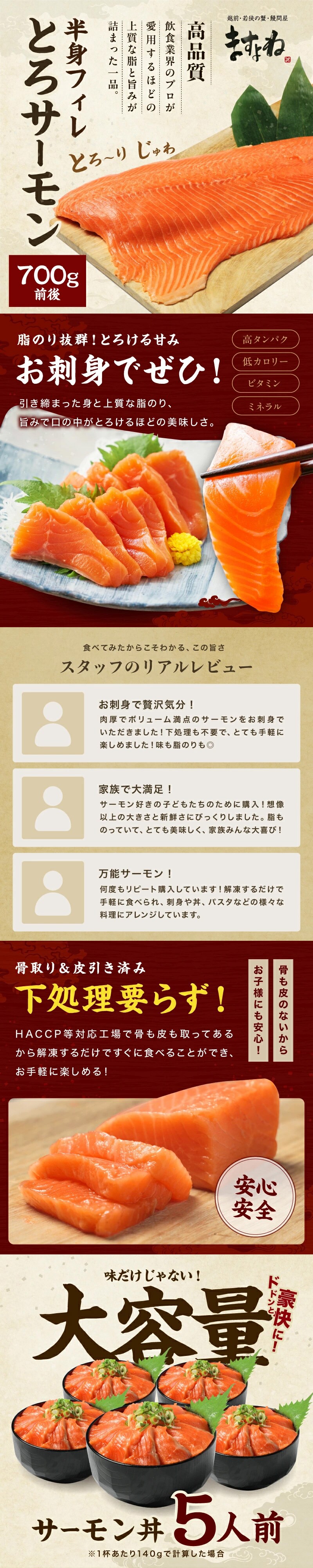 お刺身用 とろサーモン (半身フィレ) 700g前後 骨無し&皮無し ※生食用/冷凍 さーもん サーモン トラウト 刺身 お取り寄せ 業務用 冷凍のレビュー