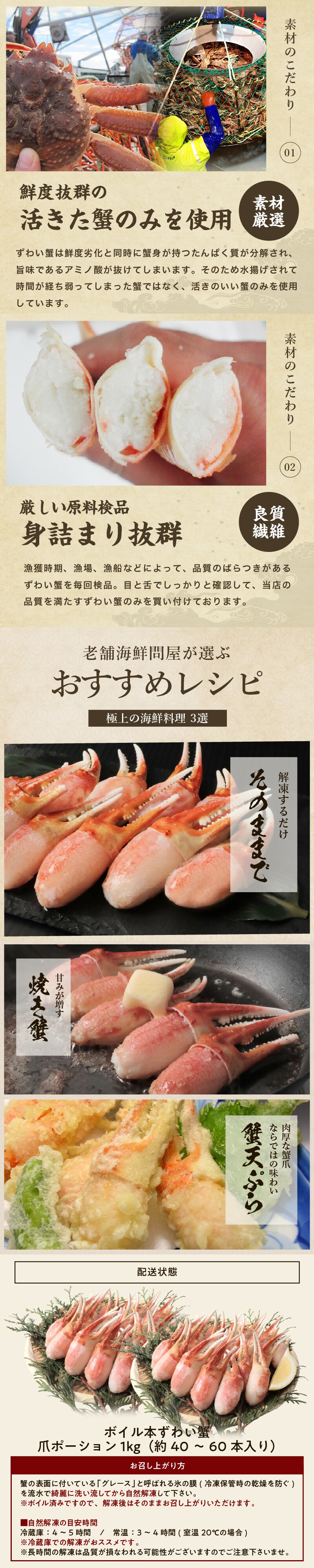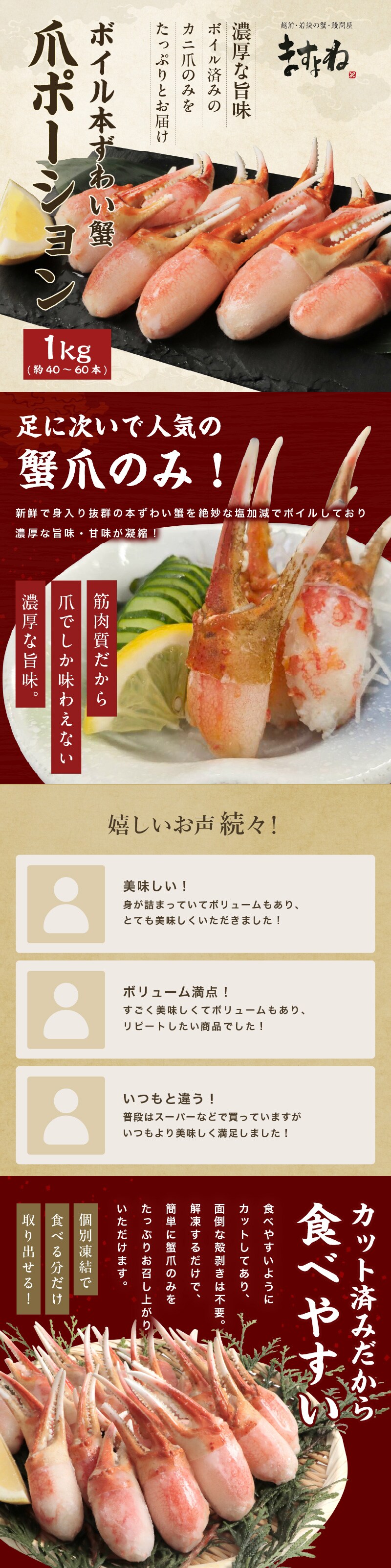 ボイル済み本ズワイ蟹 爪ポーション 1kg(500g×2袋)約40本~60本前後
