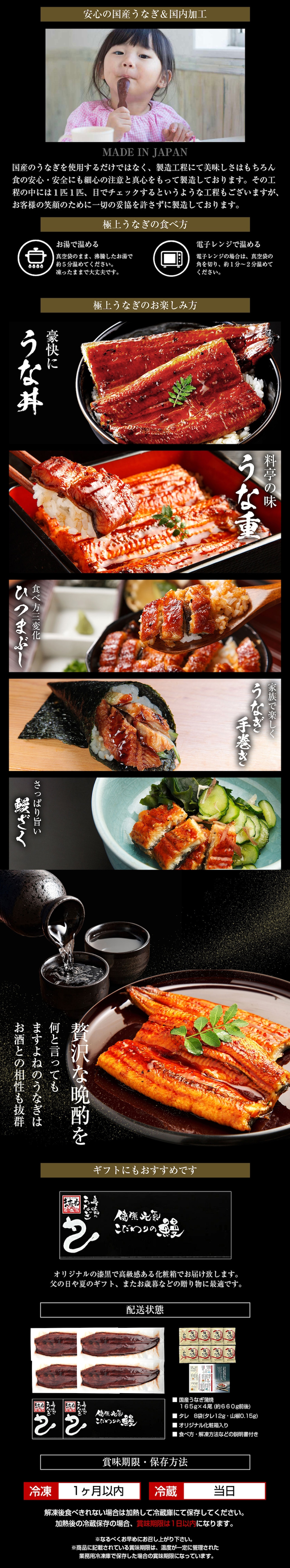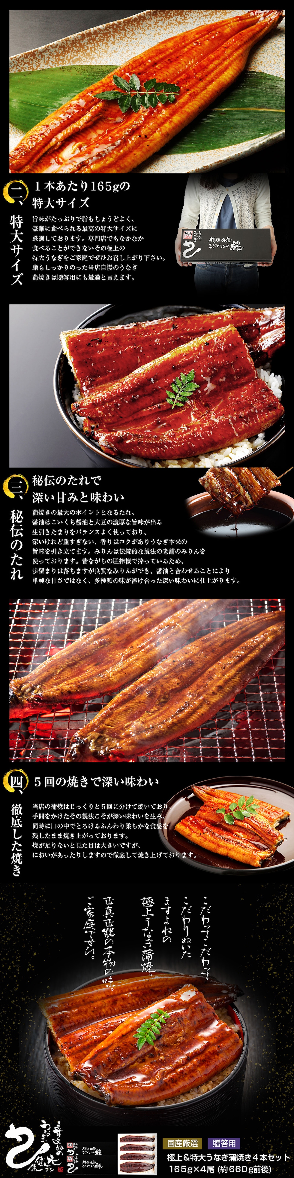 特大うなぎ蒲焼き165g前後×4本セット計660g前後