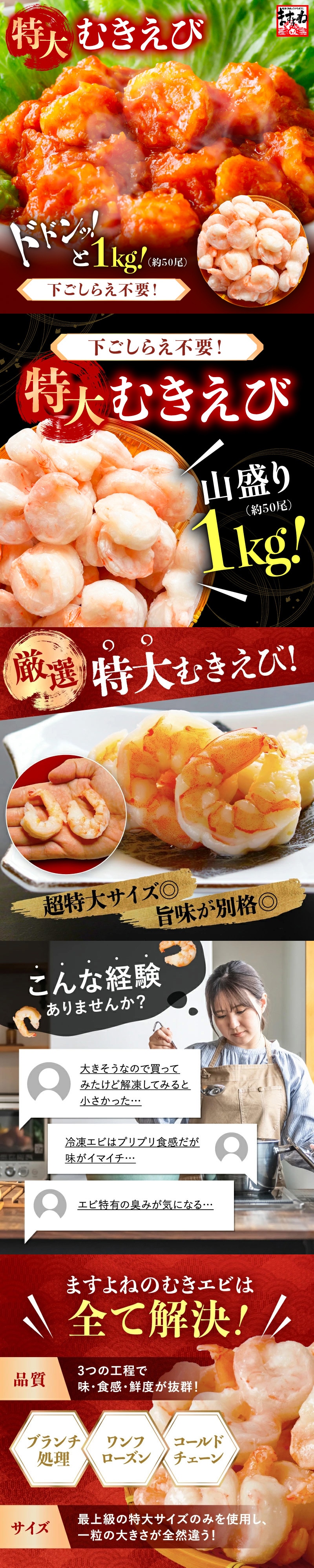 えび エビ 海老 特大むきえび 1kg / 50尾前後 (解凍後800g) (バナメイエビ/背ワタなし/ブランチング済み) 背ワタなし 海老 えび エビ ムキエビ 剥きえび 剥きエビ エビマヨ エビチリ 食品 お取り寄せ 贈り物 ますよね 送料無料
