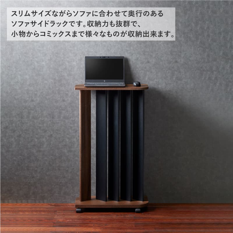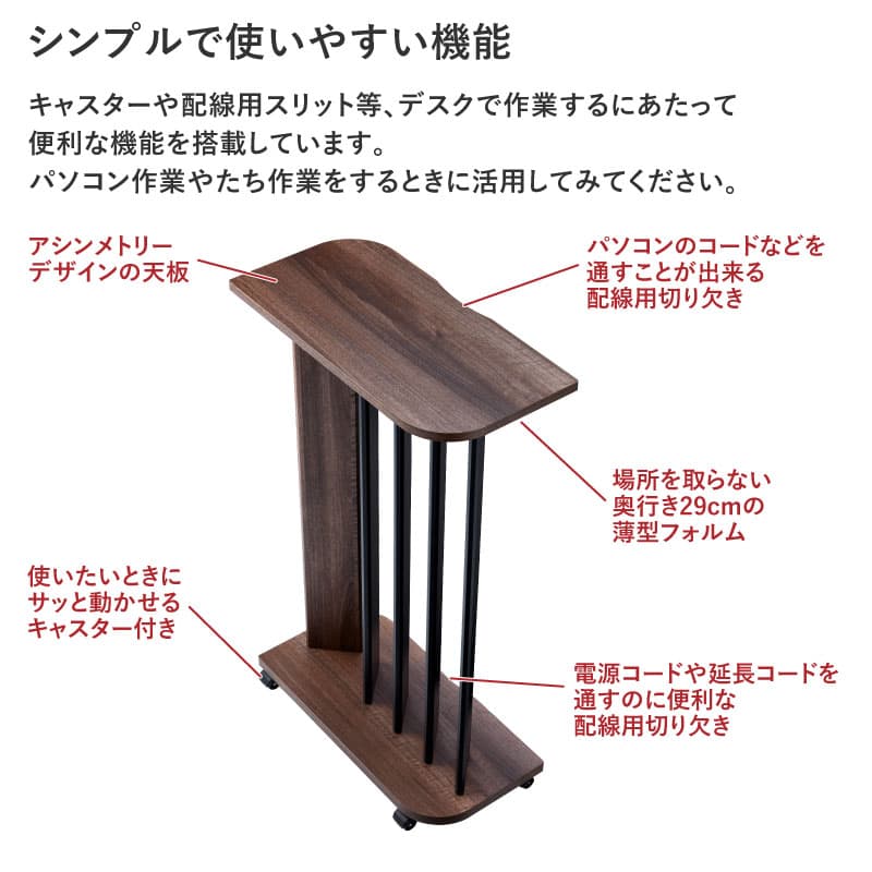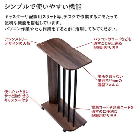 移動に便利なキャスター付き。後方に配線用切り欠きあるので壁につけての使用にも対応しています。