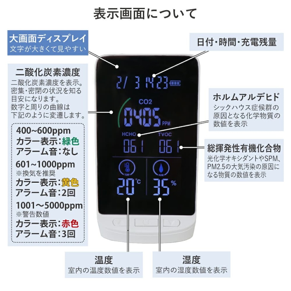 【検索キーワード】二酸化炭素濃度計測器 二酸化炭素濃度測定器 二酸化炭素濃度計 co2濃度測定器 co2 測定器 co2 NDIR式 センサー 二酸化炭素 濃度 測定器 濃度計 co2濃度測定器 二酸化炭素濃度測定器 二酸化炭素測定器 TVOC 総揮発性融合化合物 HCHO ホルムアルデヒド 温度計 湿度計 モニター 測定器 co2 センサー 二酸化炭素濃度計 二酸化炭素濃度センサー 二酸化炭素換気センサー co2 測定器 co2 センサー NDIRセンサー NDIR式センサー NDIR センサー 室内 二酸化炭素 チェッカー 二酸化炭素計 二酸化炭素計測器