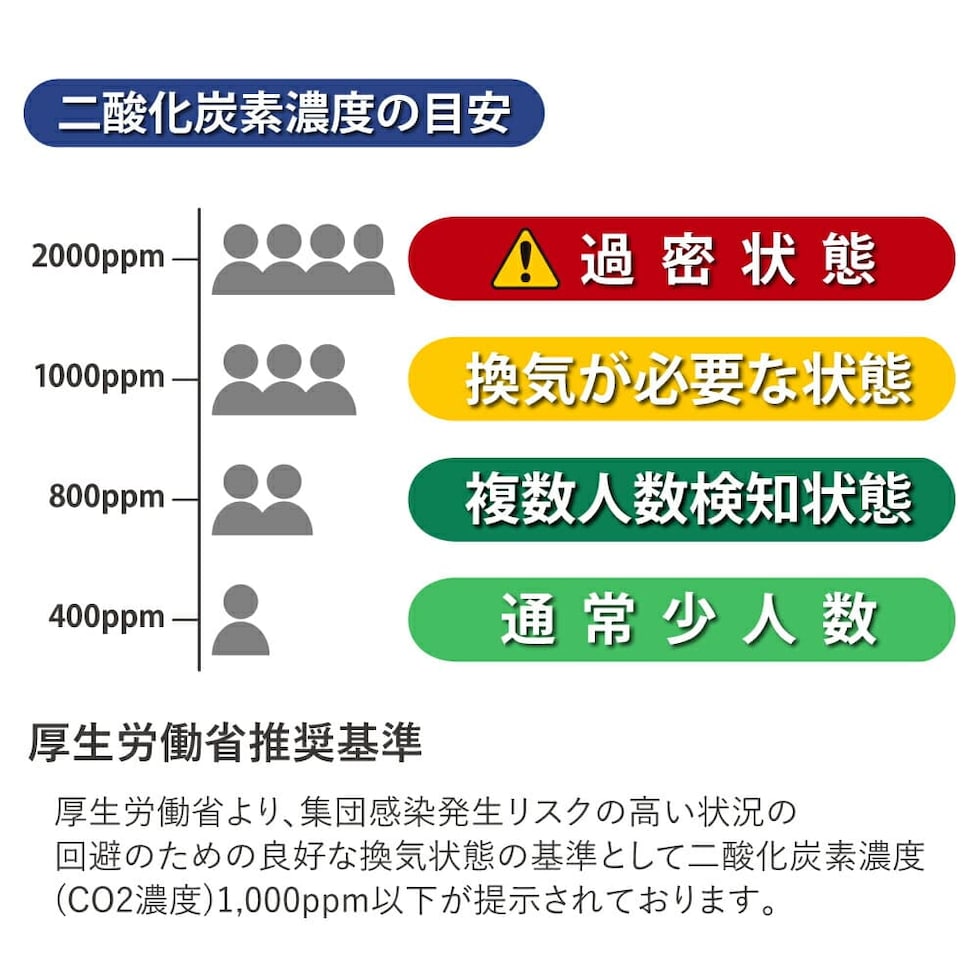 | カラー表示 | 緑色/~600ppm アラーム音なし 黄色/601~1000ppm アラーム音2回 赤色/1001~5000ppm以上 アラーム音3回 |
