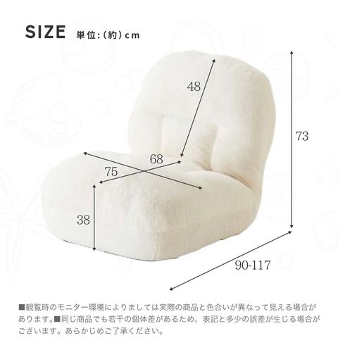 | サイズ | 幅:75cm 座面の奥行:90cm~117cm 全体の高さ:73cm |