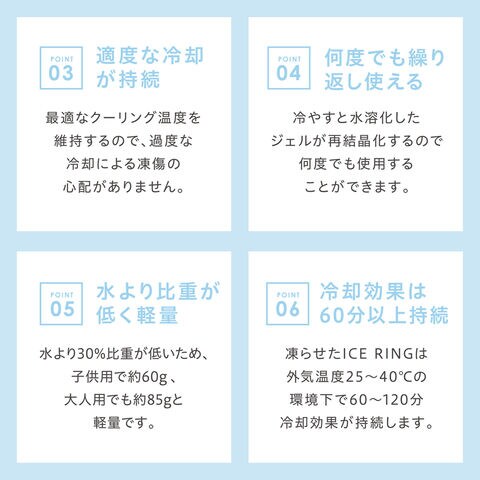 「ICERING_アイスリング」は28℃以下で自然に凍結し、手軽に暑さ対策ができるので、屋外屋内どこでも繰り返しお使いいただけるアイテムです。