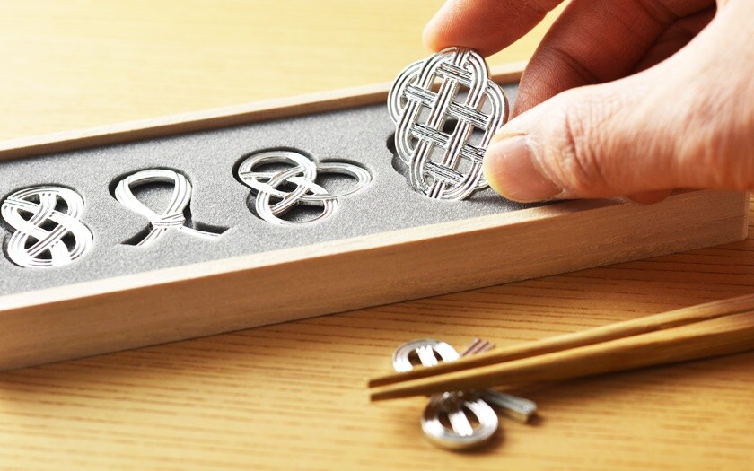 水引の「結び模様」をモチーフにしたユニークな箸置です。5つの種類があり、それぞれ異なる結び方で異なった意味を持ちます。ぜひ、その日の気分や目的に合わせてお使い下さい。