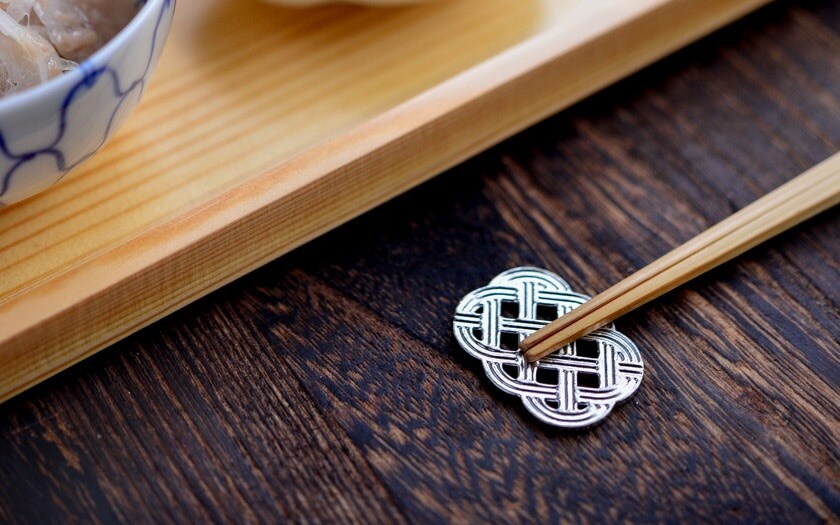錫100%で作られた能作の箸置きです。水引の結びがモチーフでおめでたい文様になっているので特に結婚のお祝いや結婚記念日(10周年の錫婚式など)にもおすすめです。また、箸置きとしてはもちろんのこと、ピンを付けてブローチにするなどアクセサリーとしてもお使いいただけます。