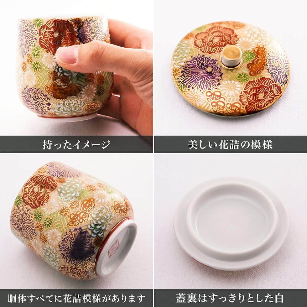 お好みの言葉を木箱の蓋裏にレーザー彫刻しお届けします。余すところなく花が描かれた九谷焼の蓋付湯呑です。絵付けには九谷焼の伝統技法「花詰」が使われており、お茶の時間を優雅にしてくれます。寒い季節でも暖かいお茶が飲める蓋付きなのも嬉しいポイントです。専用の木箱付きなので贈り物におすすめです。