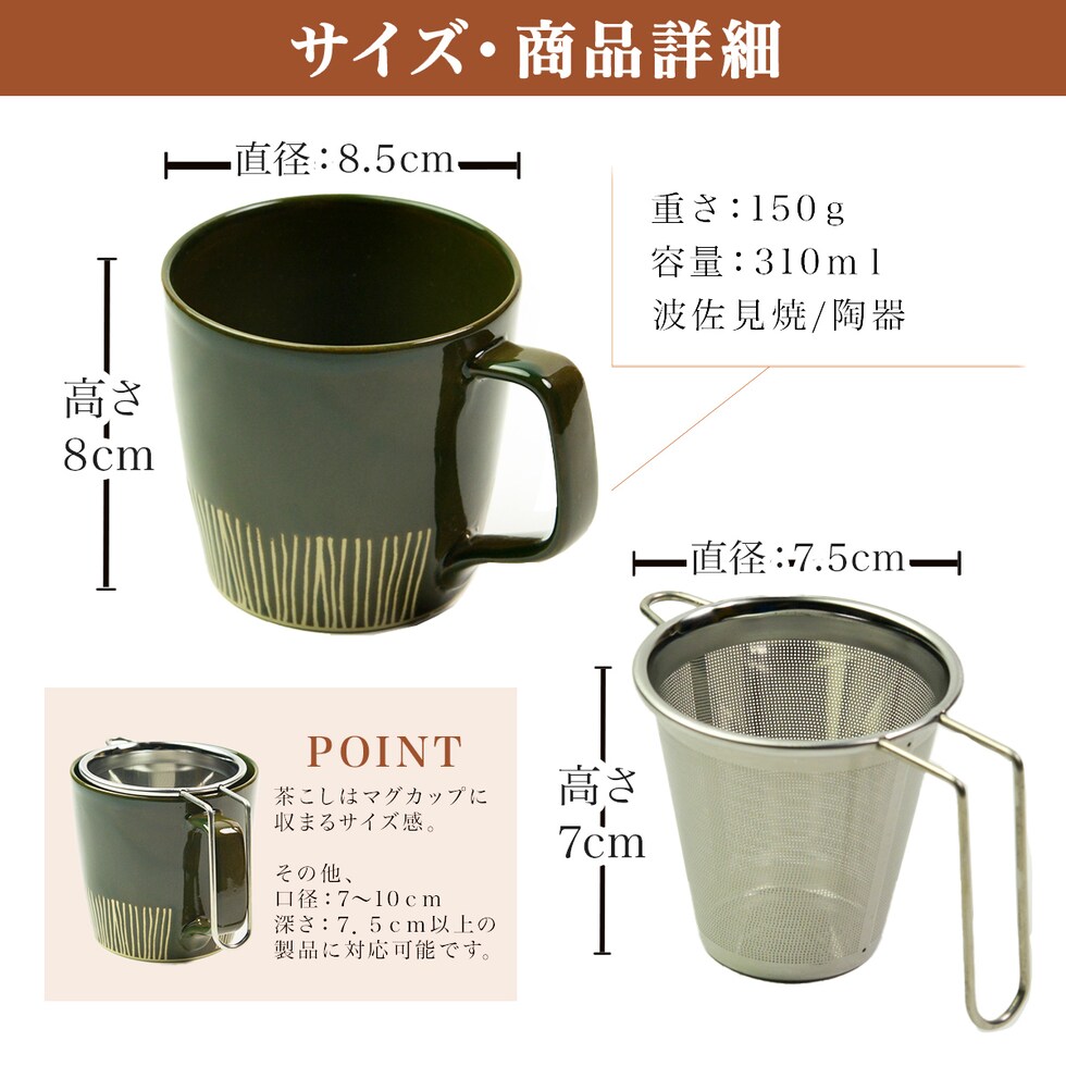寸法:[マグカップ] 直径:8.5cm × 高さ:8cm [茶こし] 幅:12cm × 外枠:7.5cm × 高さ:7cm