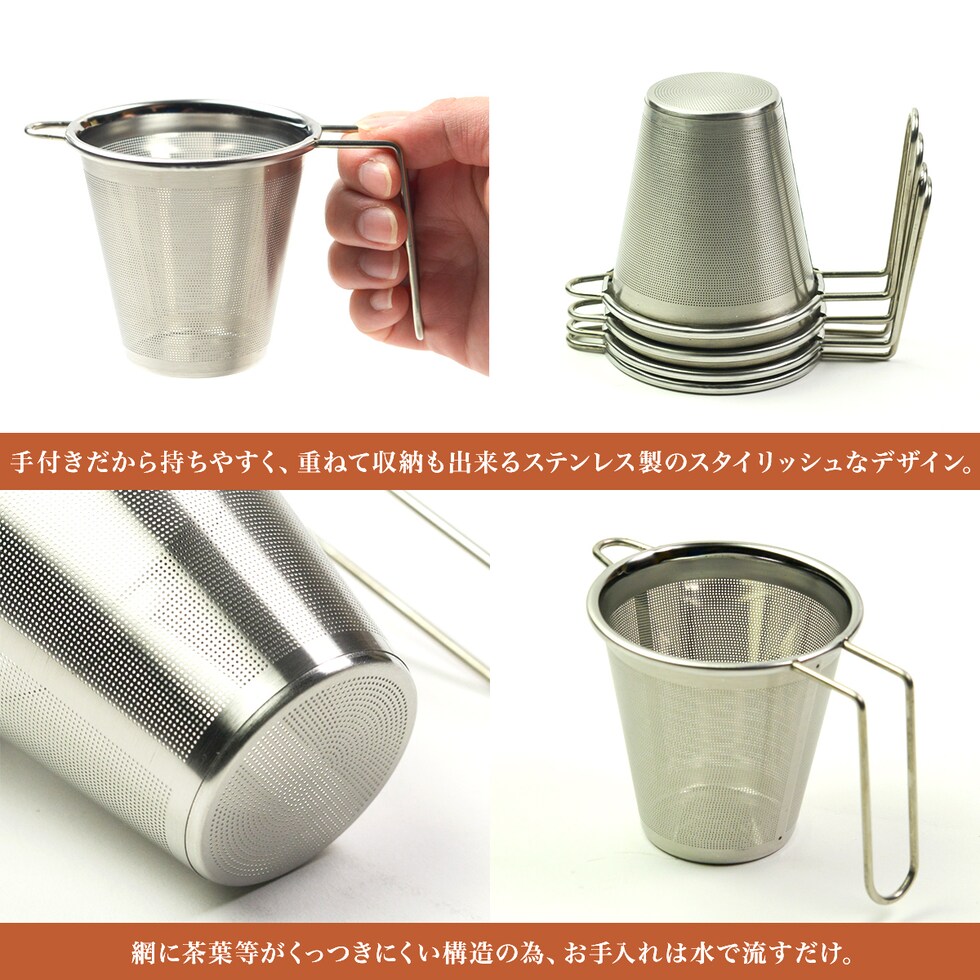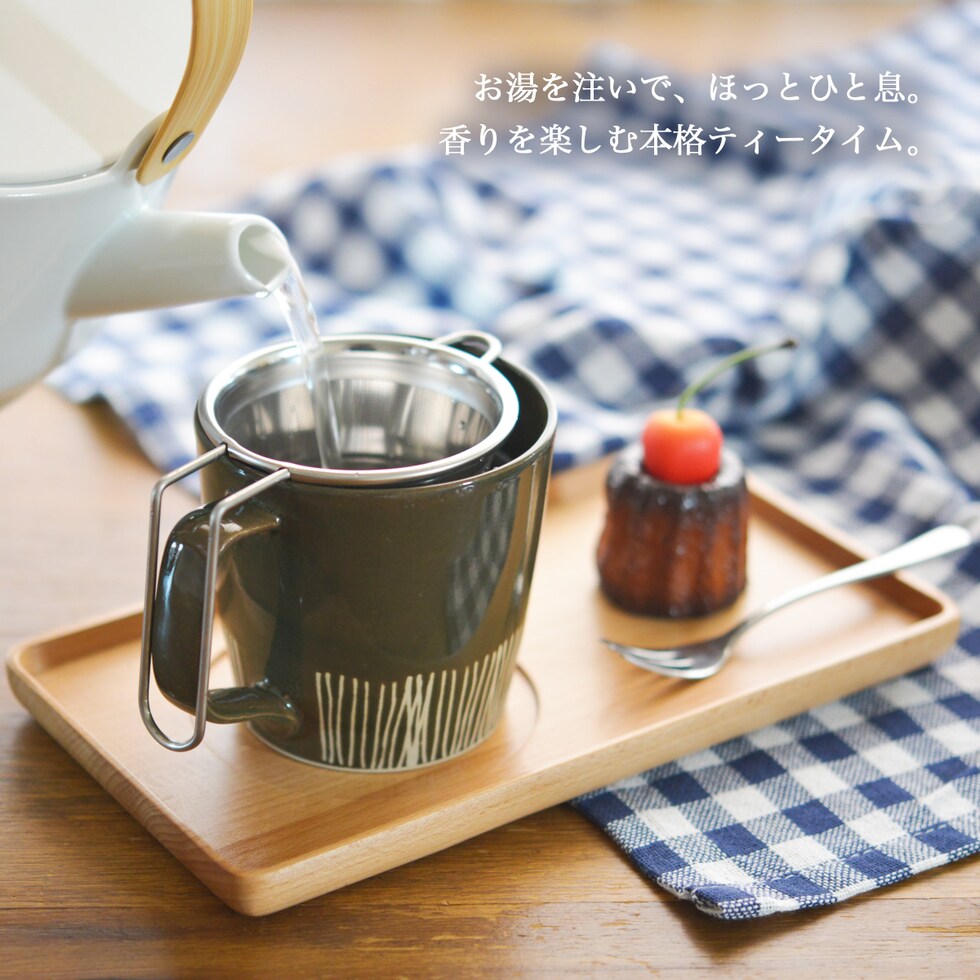 ハンドル付きのSS(スーパーステンレス)ストレーナーが登場。 ポットや急須が無くても、1人分のお茶をいつでも手軽に入れていただけます。 ステンレス板に細かな目孔が施してあり、 茶葉のかけらが出にくい構造になっているので、 深蒸し茶・ハーブティー・紅茶などに最適です。 また、網に茶葉がくっつきにくく、水で流すだけなのでお手入れ簡単◎。安心のステンレス製で、変形しにくいところも優れた点です。対応規格のサイズであれば、お手持ちのマグカップに合わせてご使用いただけます。