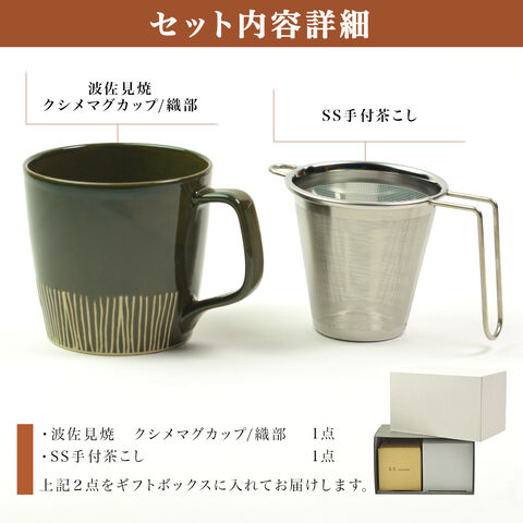 波佐見焼のマグカップと、茶こしの中でも使いやすくて人気の高いSS茶こしのセット商品です。マグカップと茶こしは当店のオリジナルギフトボックスに入れてお届けいたします。