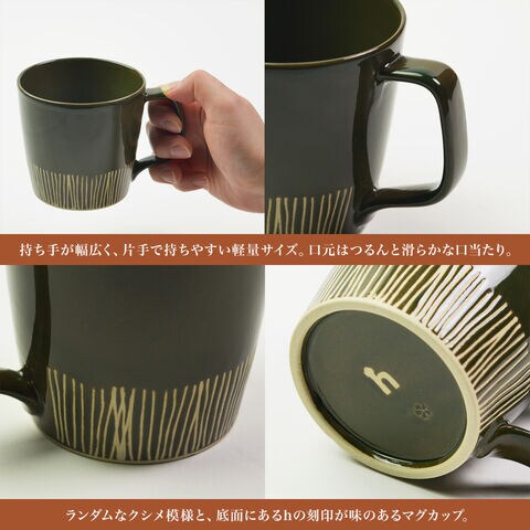 波佐見焼の軽く持ちやすいマグカップ。質感やランダムに描かれるクシメ模様が特徴です。男女問わず人気のデザインです。