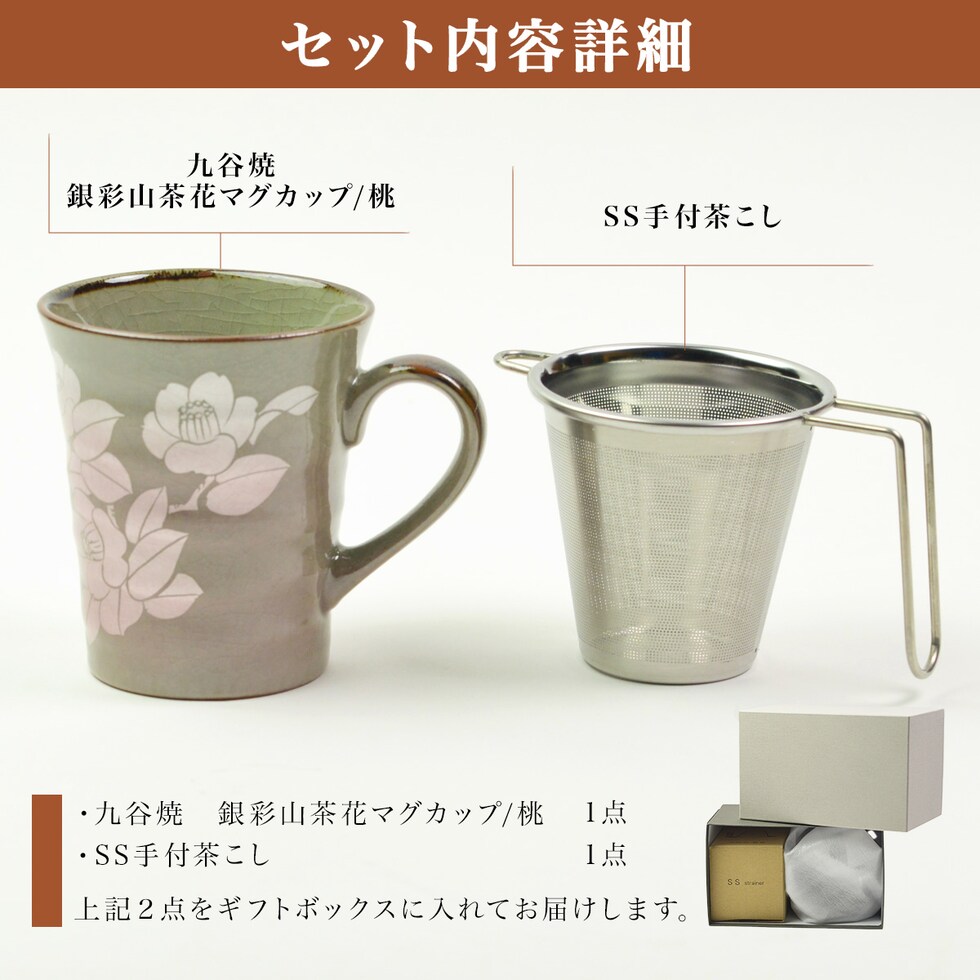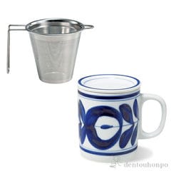 九谷焼のマグカップと、茶こしの中でも使いやすくて人気の高いSS茶こしのセット商品です。マグカップと茶こしは当店のオリジナルギフトボックスに入れてお届けいたします。