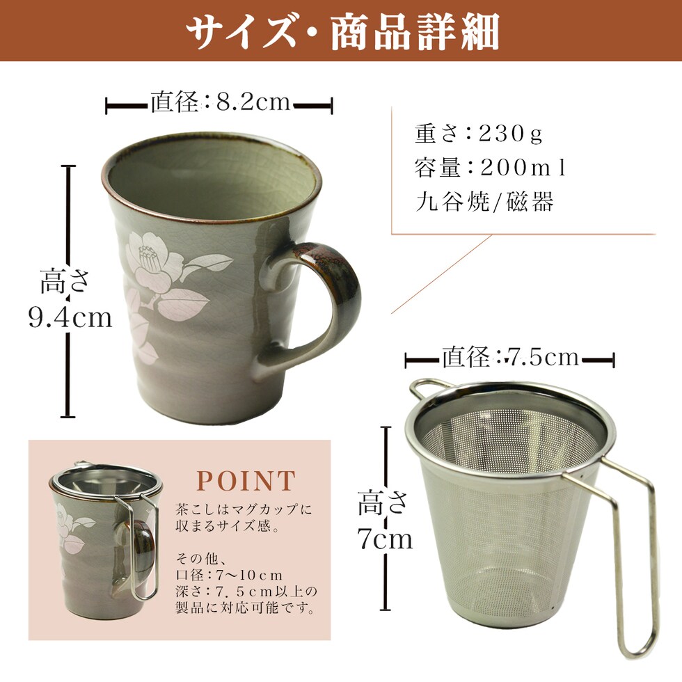 寸法:[マグカップ] 直径:8.2cm × 高さ:9.8cm [茶こし] 幅:12cm × 外枠:7.5cm × 高さ:7cm