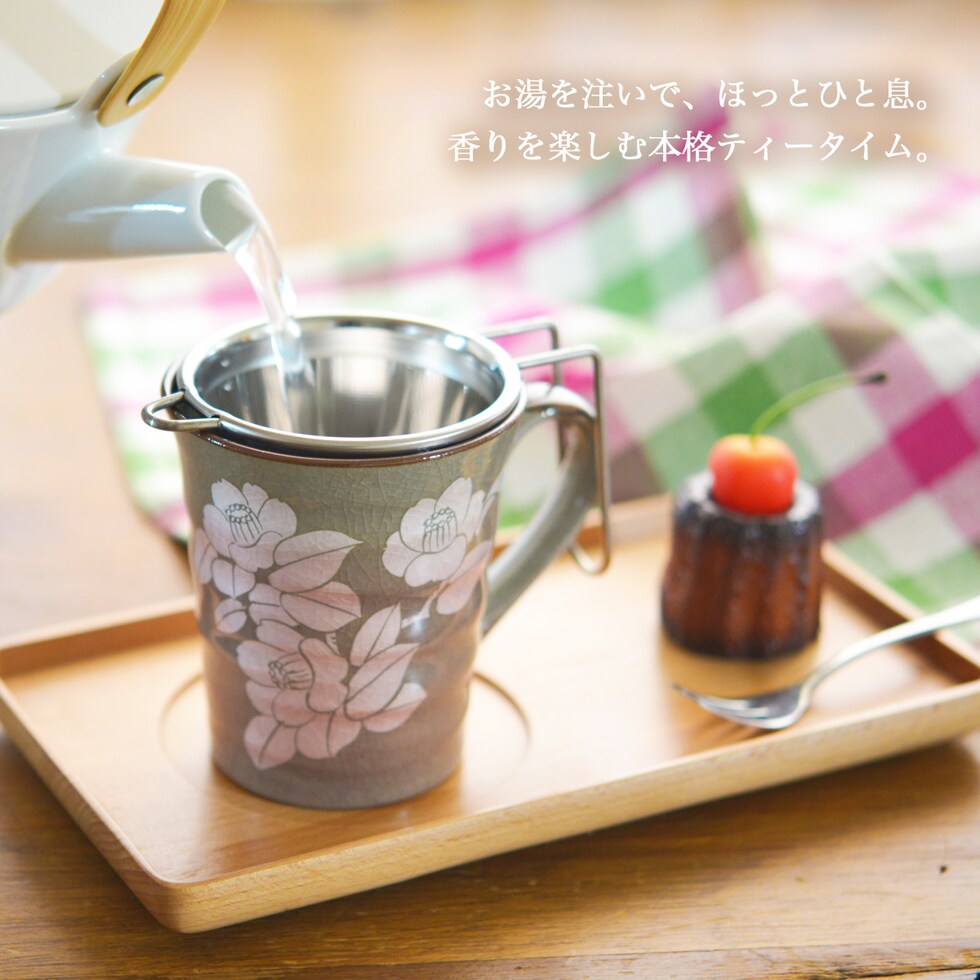 九谷焼マグカップ 茶こし付き 銀彩山茶花  ピンク ( プレゼント お茶 マグ オリジナル ティータイム 九谷焼 結婚 出産 内祝い 引き出物 金婚式 )
