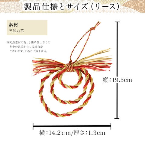 寸法:[い草門松ミニ] 高さ:12.7cm × 幅:9cm × 奥行き:5cm [木製鏡もち(本体)] 直径:9cm × 高さ:11cm [木製鏡もち(桐箱)] 横:12cm × 縦:12cm × 高さ:10cm [い草リースミニ] 縦:19.5cm × 横:14.2cm × 厚み:1.3cm