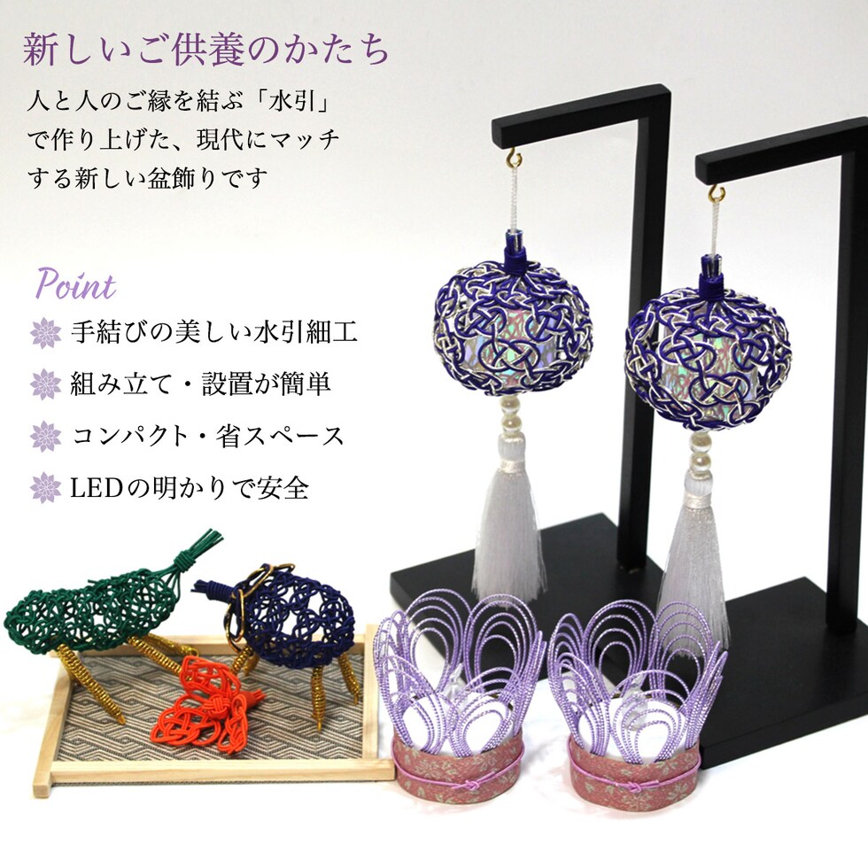 手結びの水引で仕上げた、現代の暮らしに寄り添うコンパクトな盆提灯(一対)。光が当たると中が美しく輝き、ご先祖様を迎える空間を上品に彩ります。スタンド付きで省スペースに飾れ、収納も簡単です。手のひらサイズの小さな灯明(LEDのライトで倒れても安心な構造)と、可愛らしい牛馬の盆飾りもセットでお届け。ご先祖様の乗り物とされ、玄関や盆棚に飾って供養の気持ちを表します。現代の暮らしに合うコンパクトなサイズです。京都のお香メーカー「香彩堂」のお線香「然樹香」をセットでお届けします。