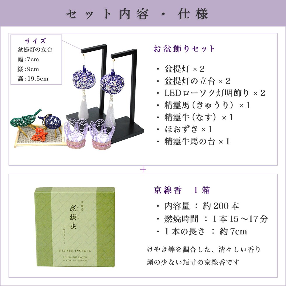 寸法:[盆提灯] 直径:5cm × 長さ:14cm [立台] 幅:7cm × 縦:9cm × 高さ:19.5cm [灯明(LEDローソク)] 縦:5cm × 横:5cm × 高さ:5cm [水引精霊牛馬 ホオズキ付(台を含む)] 縦:9cm × 横:11.5cm × 高さ:6.5cm [線香] 長さ:7cm