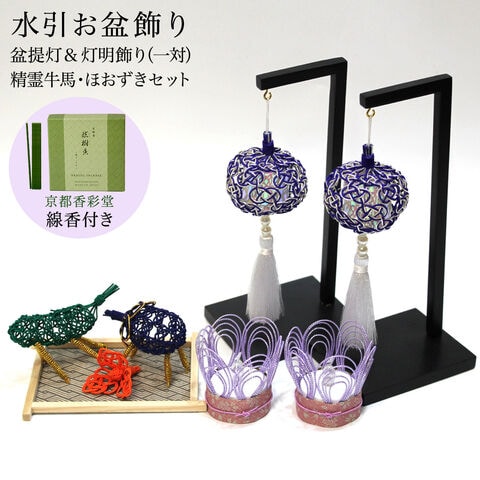 盆飾り 水引盆帰郷 盆提灯 小・LEDローソク2個(一対) 藍白 精霊牛馬・ほおずき・台付き セット 京都香彩堂 線香 付き ( 木札名入れ有料 お盆用品 お寺 )
