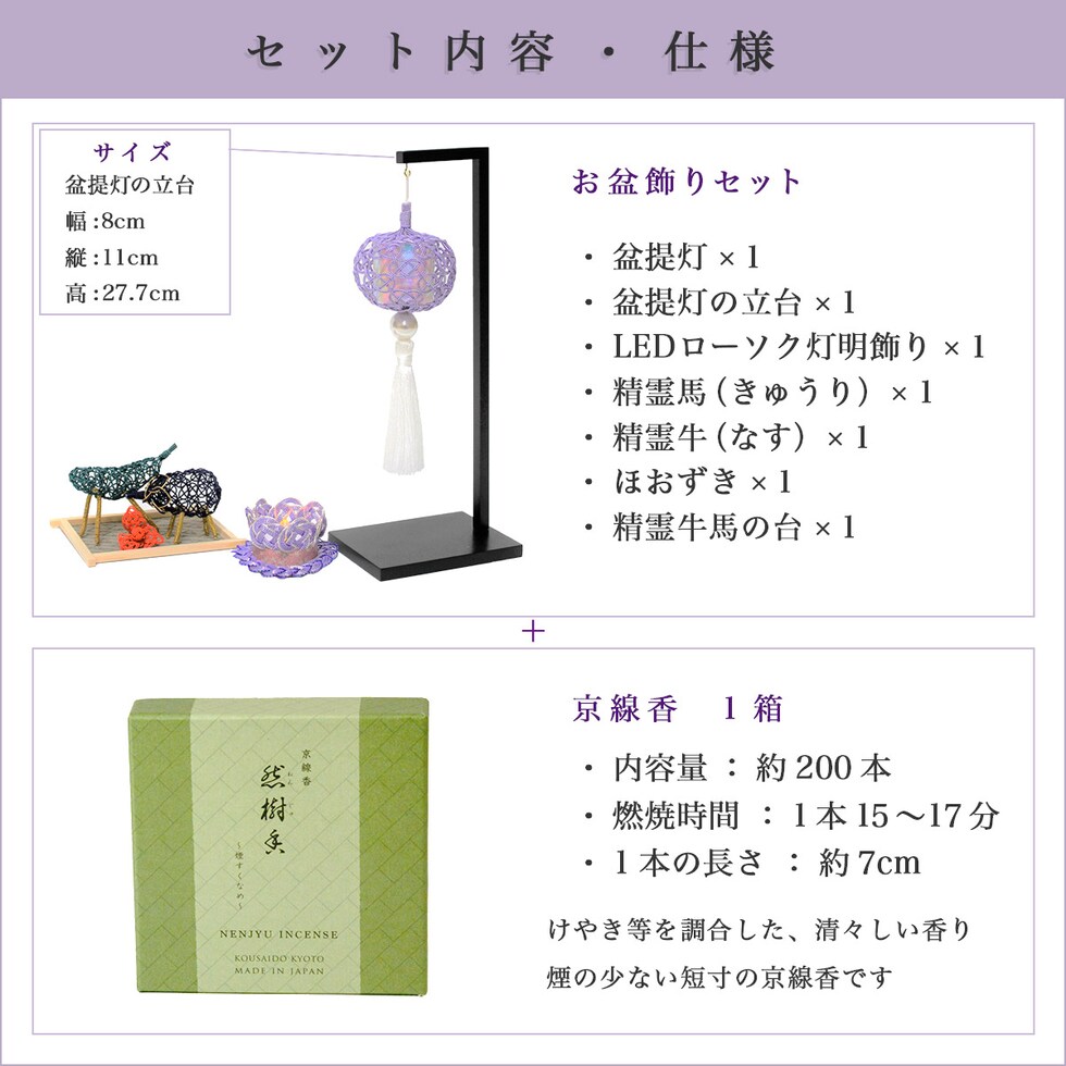 寸法:[盆提灯] 長さ:21.5cm [立台] 幅:8cm × 縦:11cm × 高さ:27.7cm [灯明(LEDローソク)] 縦:8cm × 横:8cm × 高さ:4.5cm [水引精霊牛馬 ホオズキ付(台を含む)] 縦:9cm × 横:11.5cm × 高さ:6.5cm [線香] 長さ:7cm