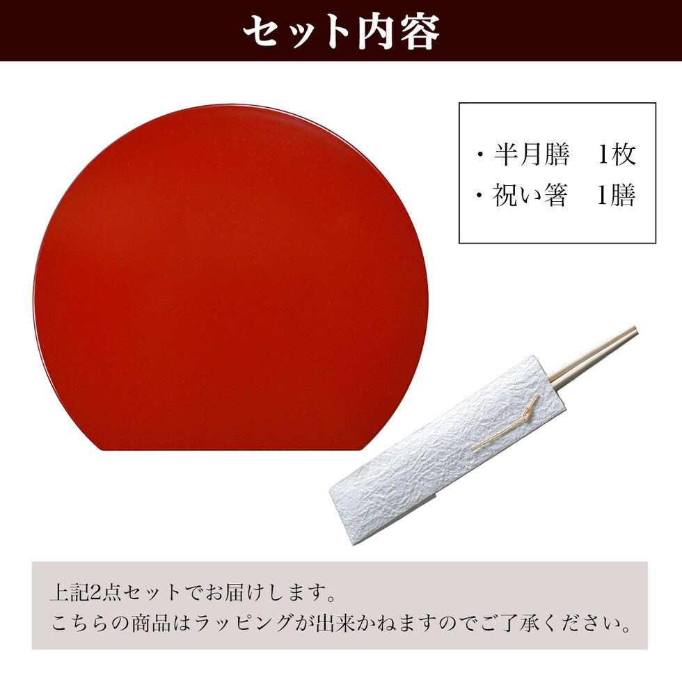 寸法:[半月プレート] 横幅:36cm × 縦:31.5cm × 厚み:0.3cm [祝箸] 幅:4.5cm × 厚み:1.8cm × 箸の長さ:24cm