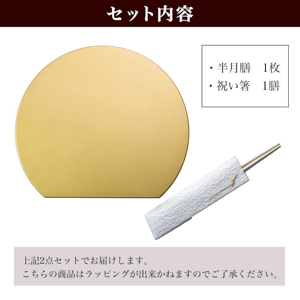 寸法:[半月プレート] 横幅:36.1cm × 縦:31.7cm × 厚み:0.3cm [祝箸] 幅:4.5cm × 厚み:1.8cm × 箸の長さ:24cm