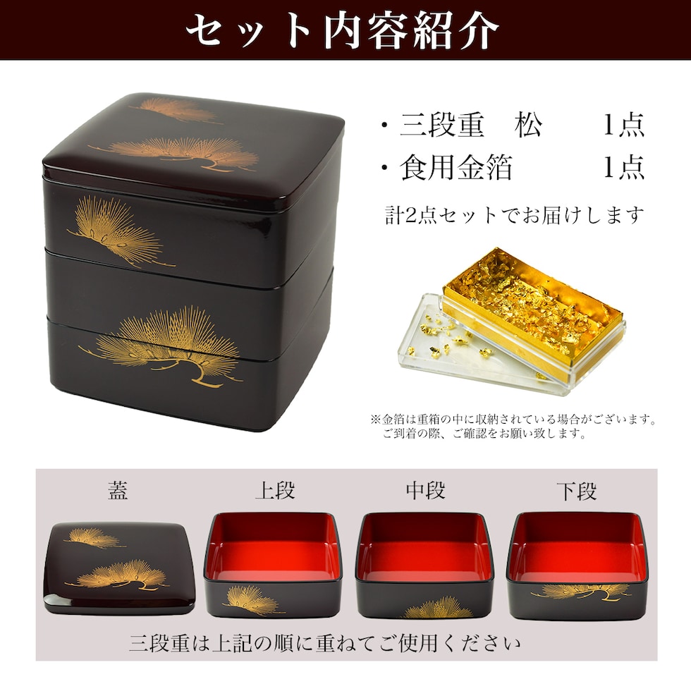 お正月やハレの日、行楽時にお使いいただける重箱です。蒔絵で描かれた美しい松が印象的な重箱。飽きることなく永くお使い頂ける逸品です。本商品は特別な日のお料理やおせち料理の飾りつけに使える食用金箔がセットになっております。