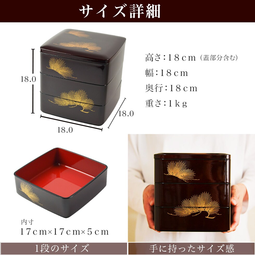 重箱 3段 松 溜色 6寸 18cm/3~4人用 食用金箔付き 2点セット ( お正月 新年 おせち ハレの日 お弁当 漆器 三段重 山中漆器 遠足 運動会 正月 おせち )
