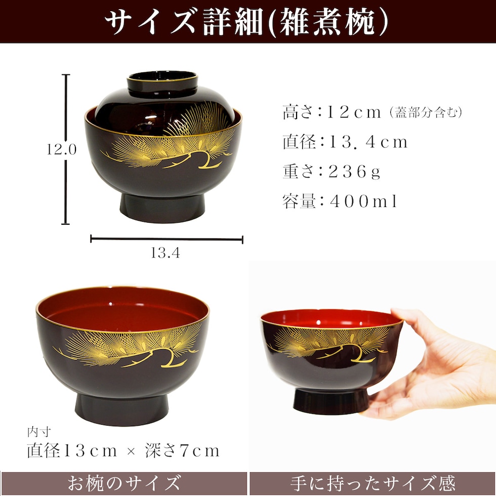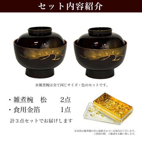 雑煮椀 2個セット 蓋付き 松 溜色 食用金箔付き ( お正月 新年 雑煮椀 お椀 お吸い物 味噌汁 お正月 山中漆器 結婚 出産 内祝い 引き出物 )