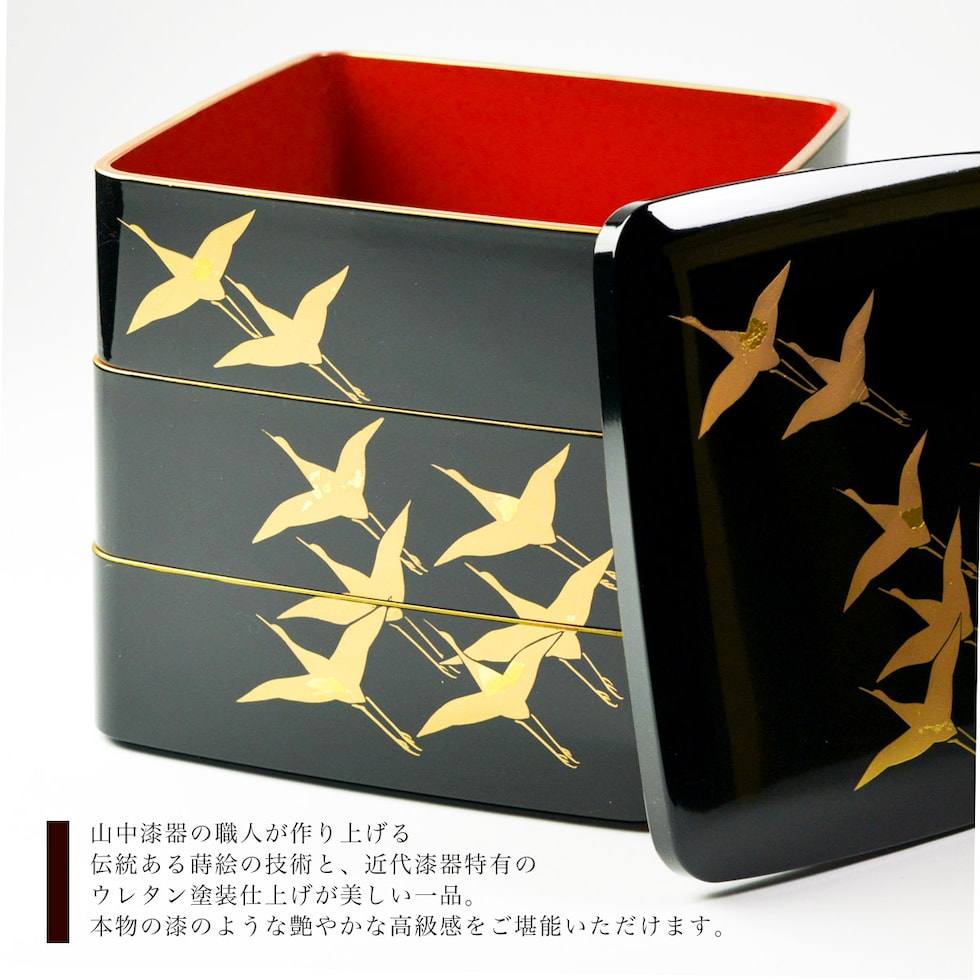 重箱 3段 6寸(1点) 雑煮椀(2点) 鶴 黒 食用金箔付き 4点セット ( お正月 新年 おせち ハレの日 お弁当 お正月 三段重 山中漆器 遠足 運動会 正月 おせち )