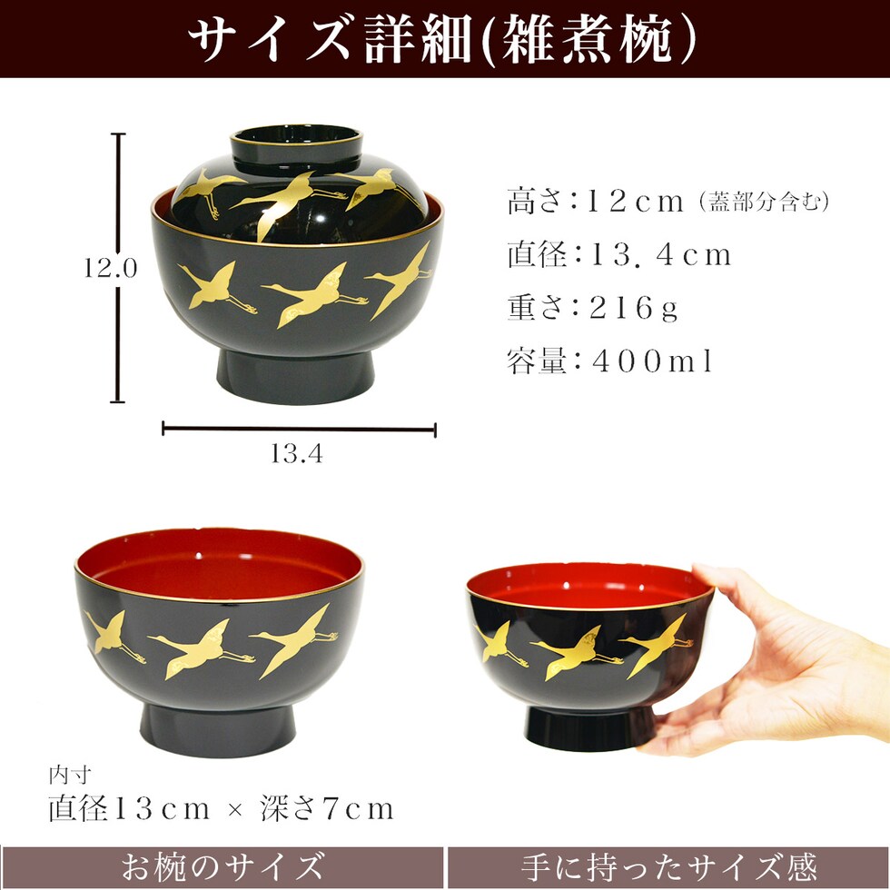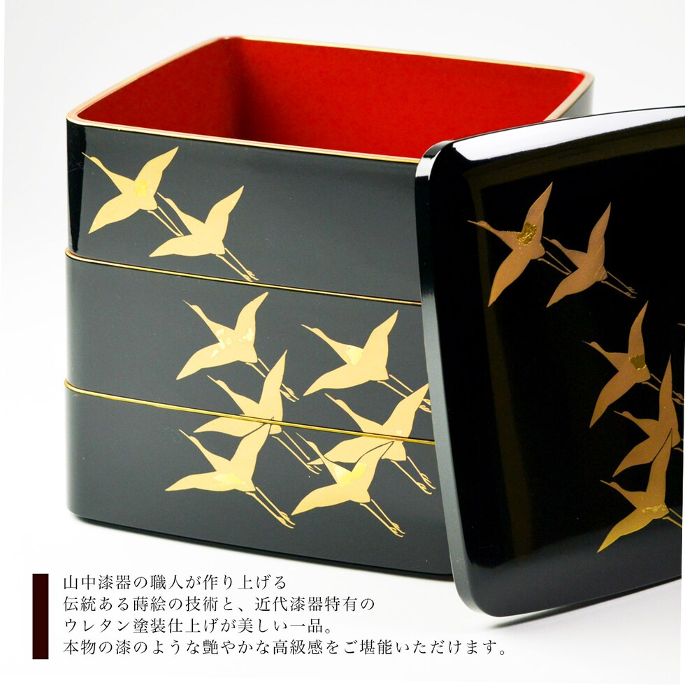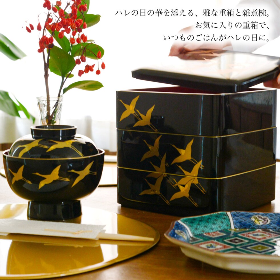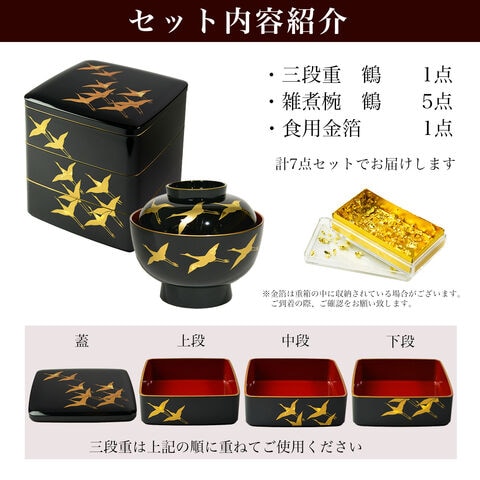 重箱 3段 6寸(1点) 雑煮椀(5点) 鶴 黒 食用金箔付き 7点セット ( お正月 新年 おせち ハレの日 お弁当 お正月 三段重 5客セット 山中漆器 遠足 )