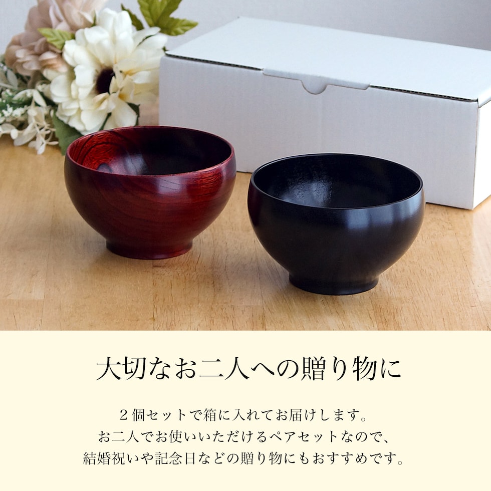 食洗機対応 木製くりぬき椀 日本の木・純国産 黒漆・朱漆 2色セット ペア箱入り ( 結婚記念日 ボウル うるし お椀 夫婦汁椀 吸い物椀 )