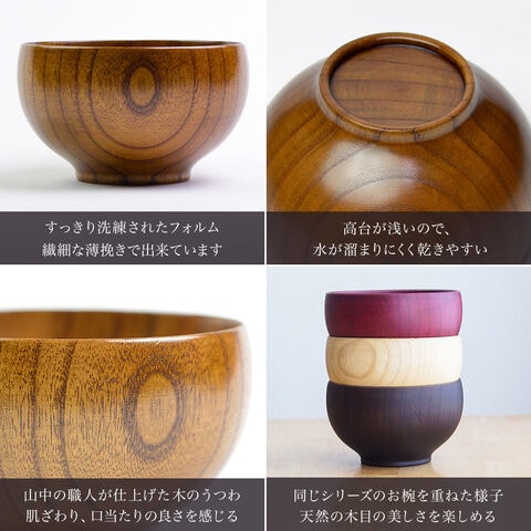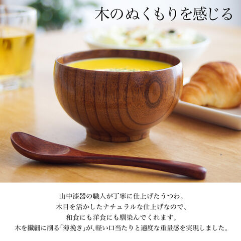 天然木と山中漆器の技が織りなす、食洗機対応の木製汁椀2個セット。温もりある木目と確かな品質は、ご夫婦の食卓に彩りを添え、汁物からデザートまで幅広く活躍します。普段使いにも、お正月やハレの日にも使える上質なうつわ。手入れも簡単で、贈り物にも最適です。