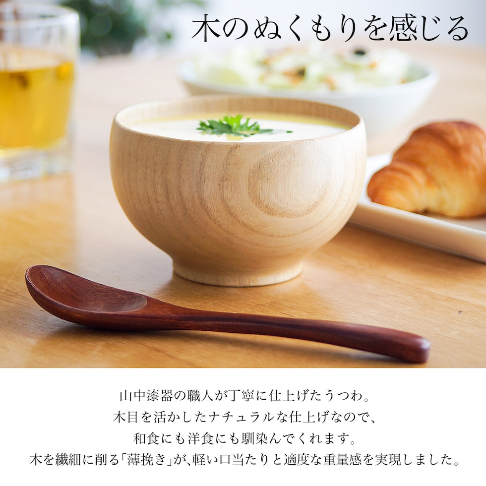 天然木と山中漆器の技が織りなす、食洗機対応の木製汁椀2個セット。温もりある木目と確かな品質は、ご夫婦の食卓に彩りを添え、汁物からデザートまで幅広く活躍します。普段使いにも、お正月やハレの日にも使える上質なうつわ。手入れも簡単で、贈り物にも最適です。