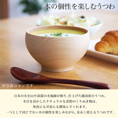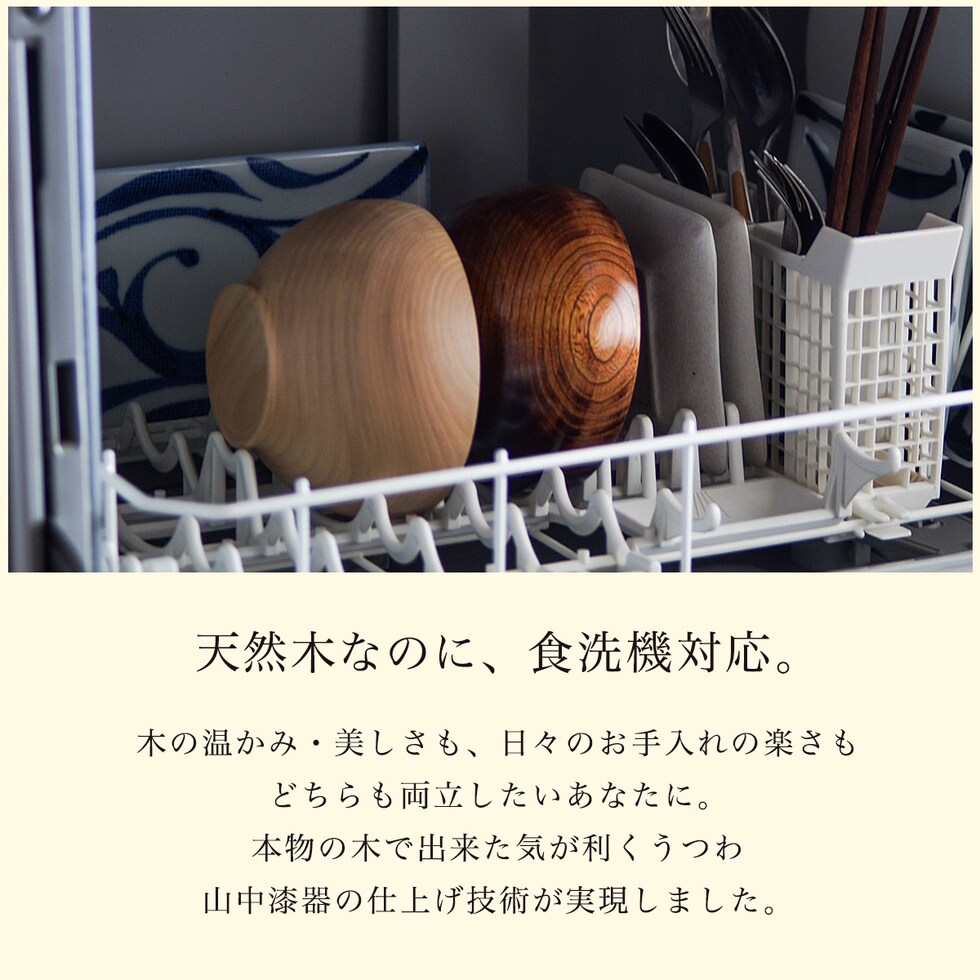 ナチュラルな木の色を活かした木製くりぬき椀の2個セットです。木地の選定・削り・磨き・塗りすべての工程を日本国内で行った山中漆器のうつわでありながら、食洗機で洗える使いやすさにもこだわった汁椀です。温もりある木目と確かな品質は、食卓に彩りを添え、汁物はもちろんデザートなど、マルチボウルとして幅広く活躍します。食洗機対応で普段の手入れも簡単。結婚祝いや記念日などの贈り物にも最適です。