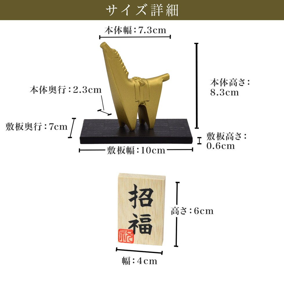 寸法:[本体] 横:7.3cm × 奥行:2.3cm × 高さ:8.3cm [敷板] 横:10cm × 奥行:7cm × 高さ:0.6cm [招福木札] 幅:4cm × 高さ:6cm