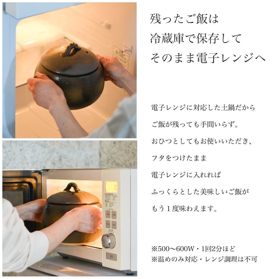 釉掛けが施された丸くて可愛らしい日本製の直火専用炊飯土鍋です。土鍋は火にかけるとゆっくりと温まり、一度温まると冷めにくいため、お米の芯までじっくりと均一に熱を伝え、土鍋から放出される遠赤外線効果により、お米の旨味や栄養を損なうことなく、ふっくらと美味しく仕上げることができます。電子レンジ対応の為、残ったご飯をそのまま冷蔵庫で保存し直接電子レンジで温め可能な1台2役の優れもの。鍋敷き付きです。