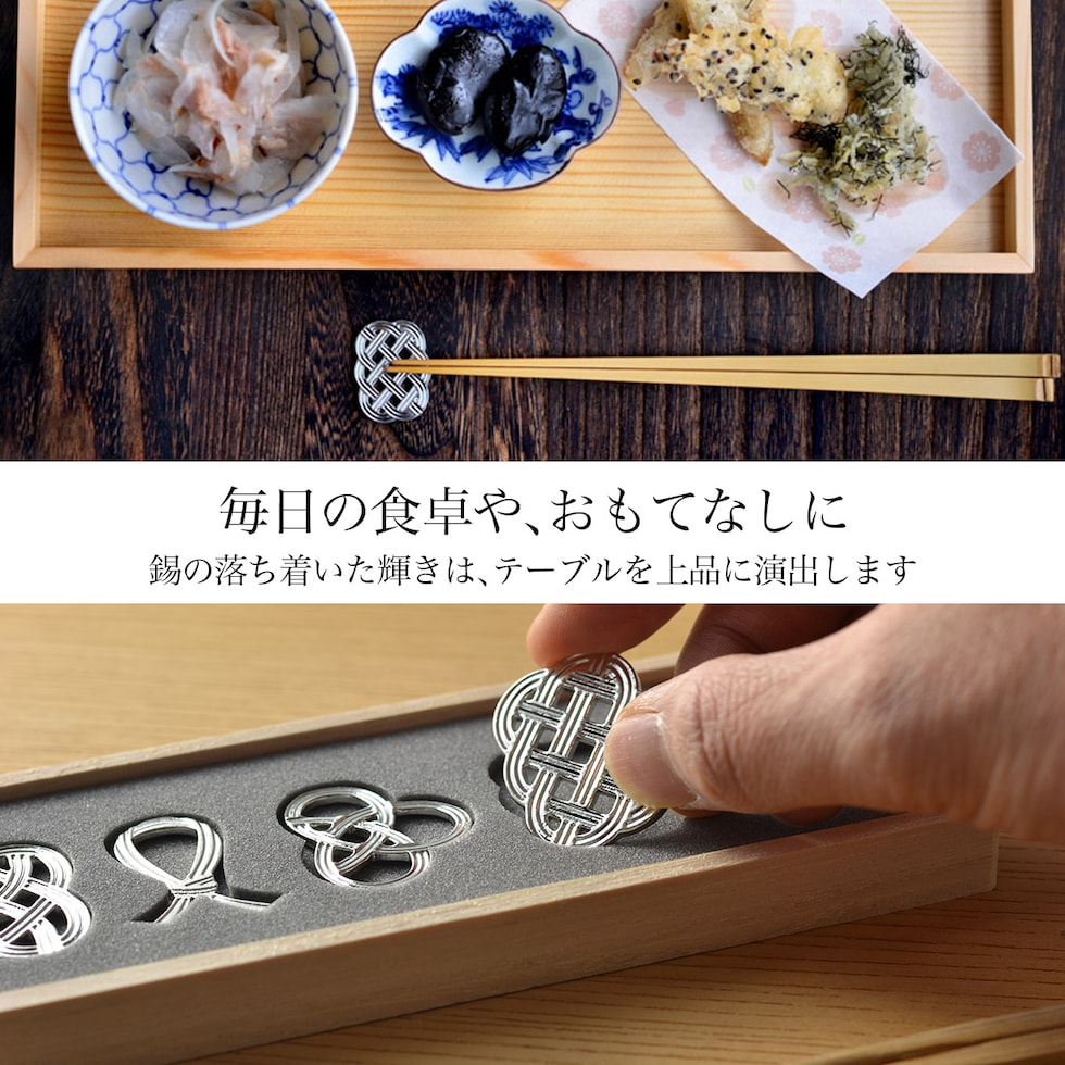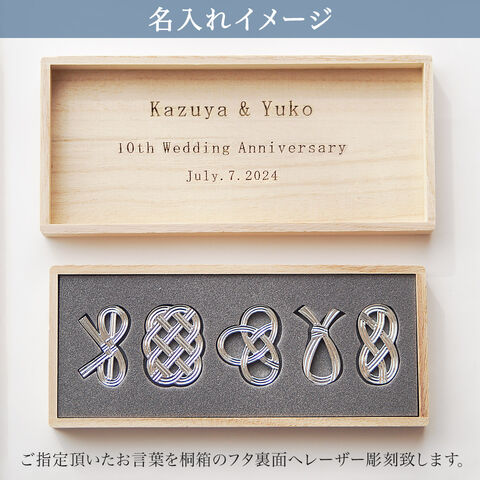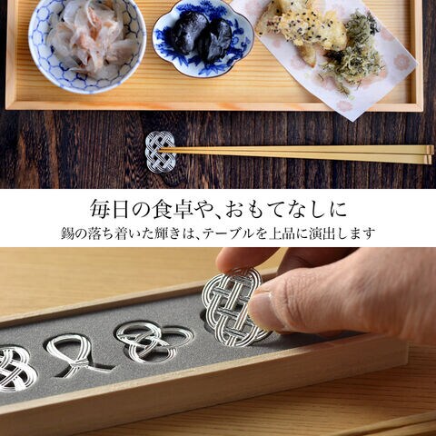 錫100%で作られた能作の箸置きです。水引の結びがモチーフでおめでたい文様になっているので特に結婚のお祝いや結婚記念日(10周年の錫婚式など)にもおすすめです。また、箸置きとしてはもちろんのこと、インテリアとしてや、ピンを付けてブローチにアレンジしてもお使いいただけます。本商品は付属の桐箱(蓋裏)にレーザー彫刻名入れができるセット商品です。