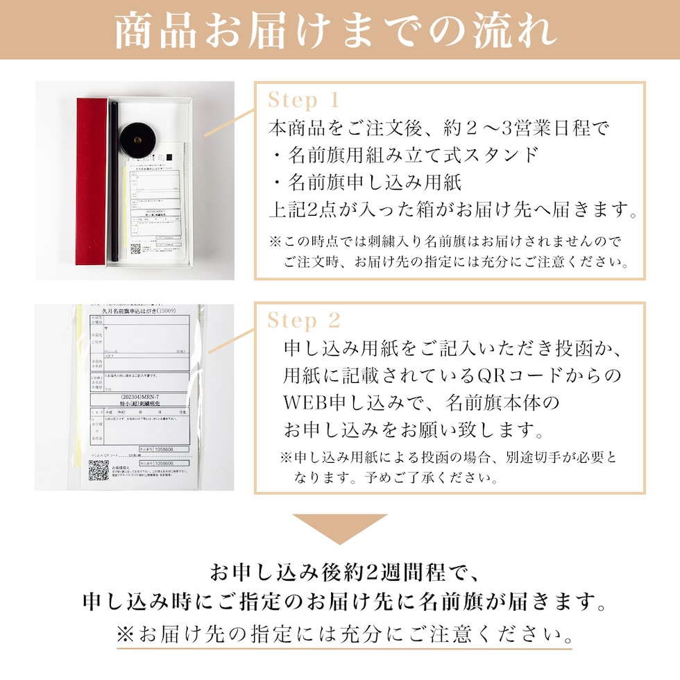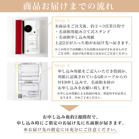 ※名前旗はご注文後お届けするお申込書およびQRコードより、お申込みいただく流れとなります。お届けの納期、お届け先の指定には充分ご注意ください。