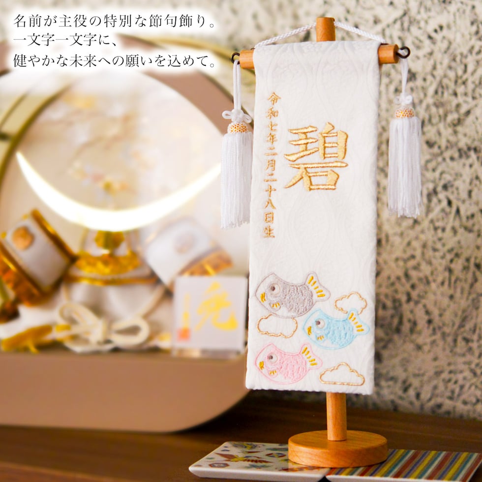お子様の健やかな成長と幸せを願う世界に一つだけの「名前旗」。お子様のお名前や生年月日をお入れしてお作りする、特別な記念飾りです。節句飾りの横に飾ることで、お祝いの雰囲気をより華やかに演出します。初節句のお祝いはもちろん、お孫様への贈り物や出産祝いとしてもおすすめです。