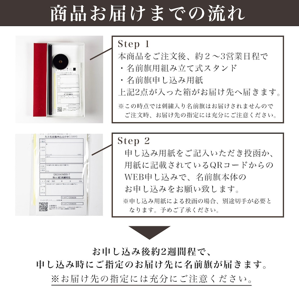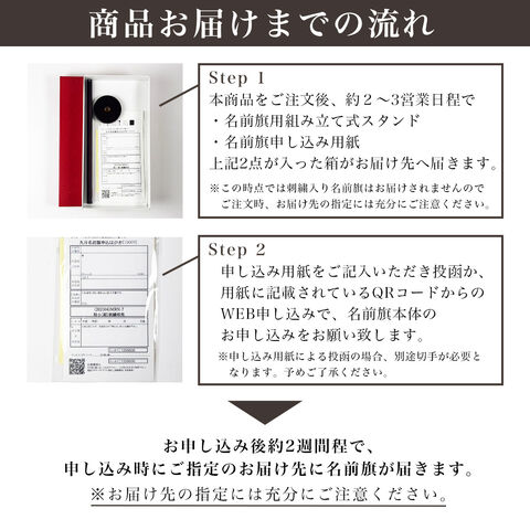 ※名前旗はご注文後お届けするお申込書およびQRコードより、お申込みいただく流れとなります。お届けの納期、お届け先の指定には充分ご注意ください。