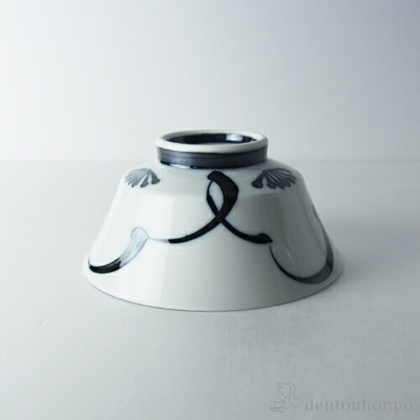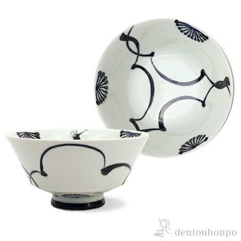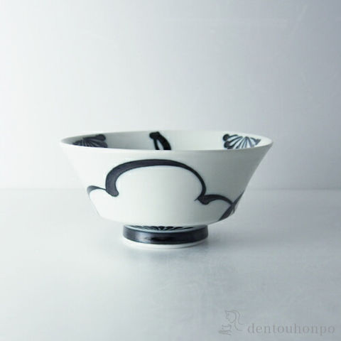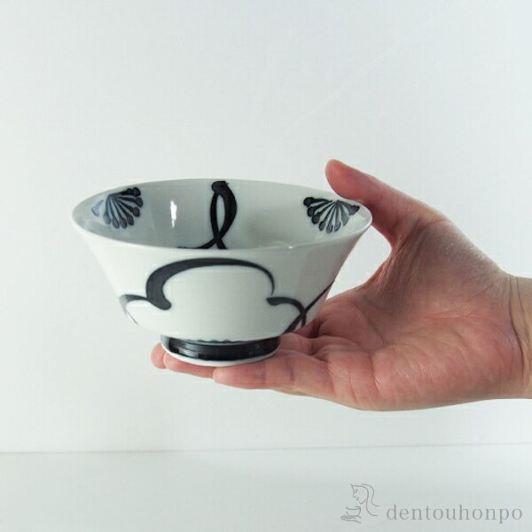 扇子の様な末広がりな形には、広がり栄える意味が込められています。器の内外には、江戸時代の人々が好んで身に付けた3種の縁起柄が描かれ、味わい深い佇まいです。こちらは、女性用のお茶碗にちょうどいいサイズです。